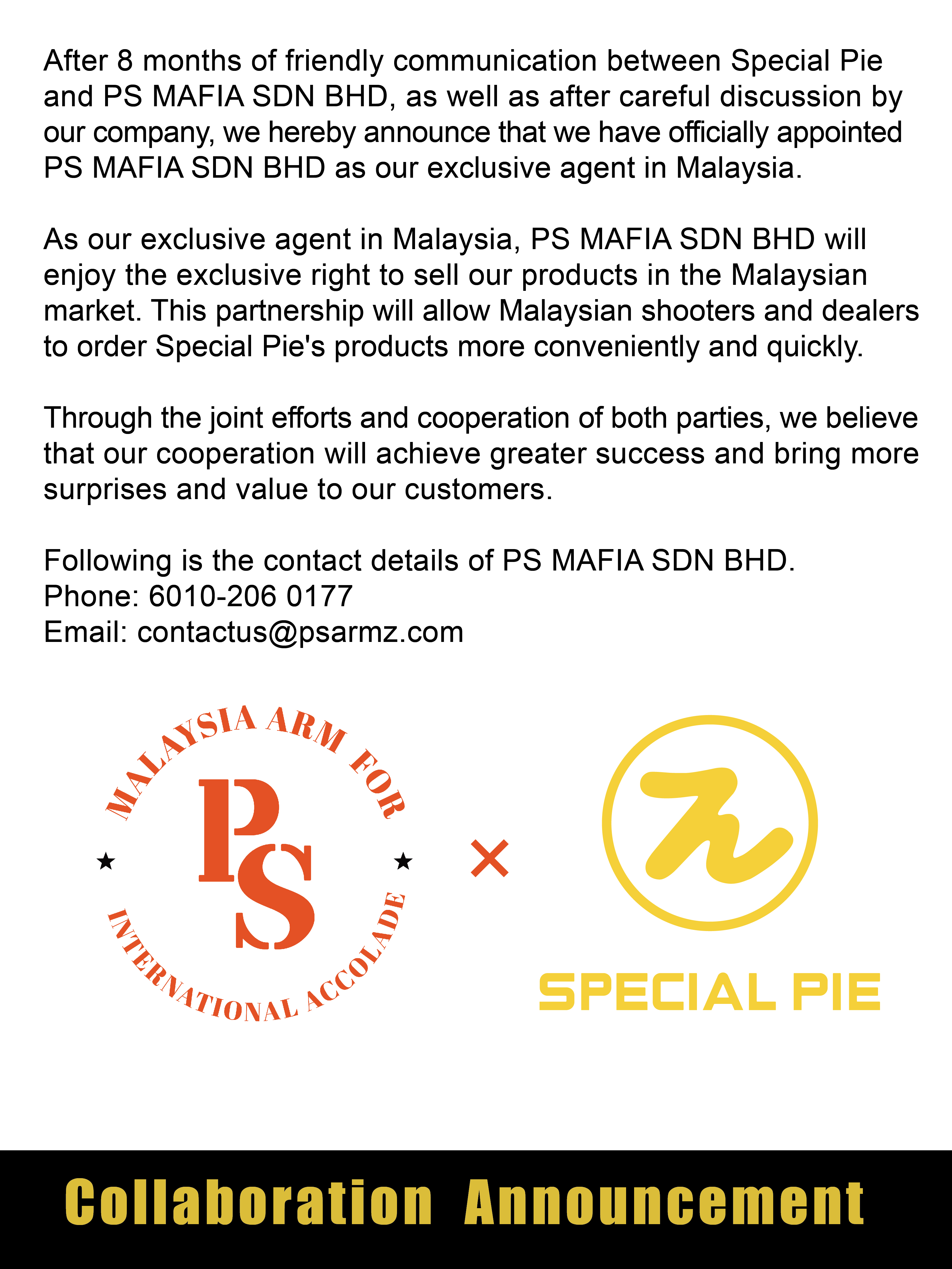 After 8 months of friendly communication between Special Pie and PS MAFIA SDN BHD, as well as after careful discussion by our company, we hereby announce that we have officially appointed PS MAFIA SDN BHD as our exclusive agent in Malaysia.